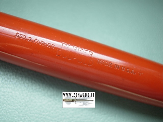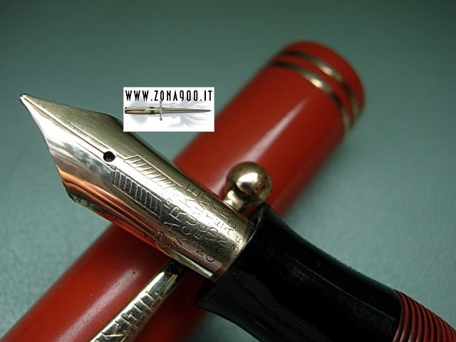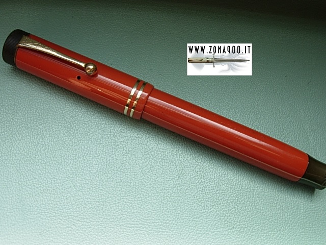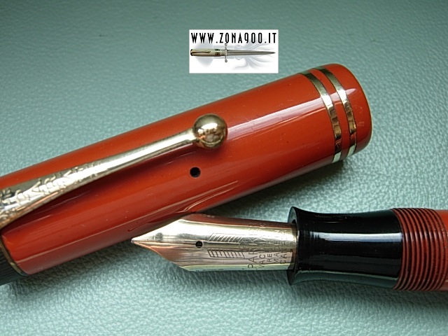 | Vintage Parker Duofold Sr flat top fountain pen late version small imprint form late twenties in orange celluloid, approx 14 Cm comes with Parker 14K gold arrow nib F flex made in Canada vey smooth, excellent conditions, no cracks, brassing or damages, few surfacely signs, hard rubber parts discolored, button filler in working order -ITEM SOLD- To buy or asking info please send a mail to pens@zona900.it specifying product code Thank you. |