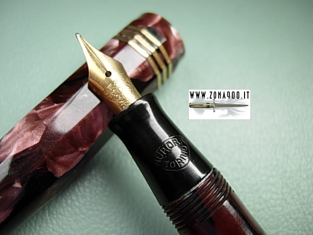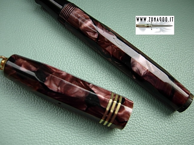 | Aurora Novum second series faceted shape from middle thirties, in not common at all pink/violet celluloid, lady size original Aurora 14K #0 gold nib F flex, small signs, no brassing, crisp imprint, bottom lever filler in working order. To buy or asking info please send a mail to pens@zona900.it specifying product code Thank you. |