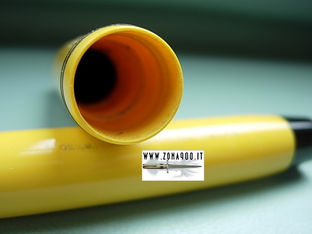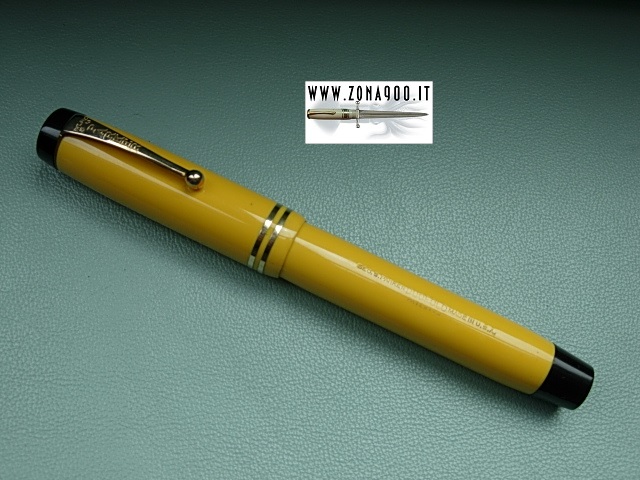 | Vintage Parker Duofold Sr Streamline fountain pen made in USA from late twenties, mandarin yellow celluloid, approx 13 Cm long, original Parker 14K gold nib F, near mint to mint conditions, perfect colour even on hard rubber parts, no cracks, brassing or damages, no remarkable signs, button filler in working order. One of most beautyful mandarin I ever seen, looks like never been inker or inked once, don't miss it if you like rare perfect pens. -ITEM SOLD- To buy or asking info please send a mail to pens@zona900.it specifying product code Thank you. |