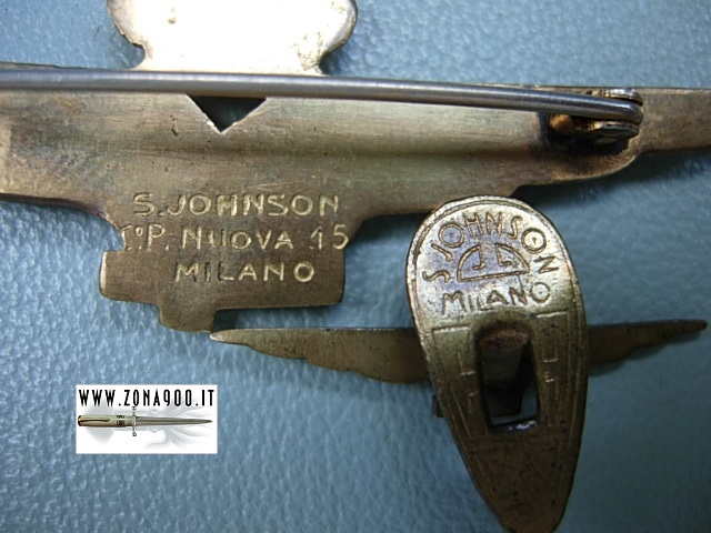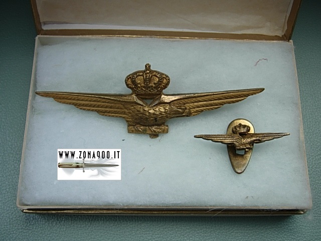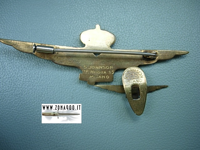 Raro distintivo Brevetto da pilota 75x25mm circa da uniforme, attacco a spilla S Johnson Milano, distintivo da pilota 30x10mm circa da abito civile, marcato S Johnson Milano, condizoni splendide, conservati in astuccio omonimo. Per info indicare il codice prodotto pens@zona900.it Grazie |