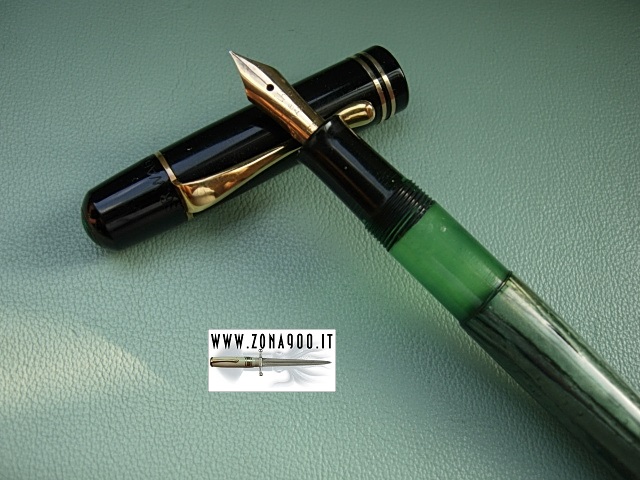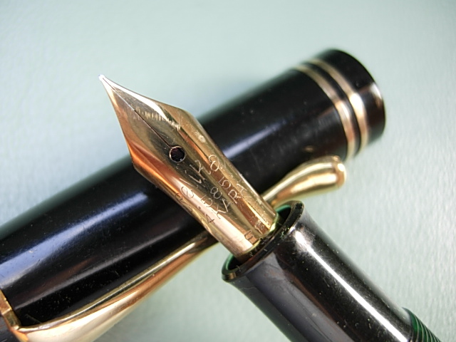 | 1940'S Pelikan 100N fountain pen, blac cap, green celluloid barrel, original Pelikan 14K gold EF gold nib flex,