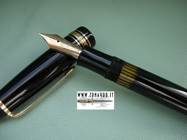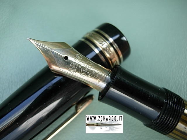 (bit discolored as in images) great conditions, no cracks, brassing or damages, few surfacely signs only, perfect yellow ink window, AD egraved on cap, looks like been inked once, piston filler in working order, comes with original box. -ITEM SOLD- To buy or asking info please send a mail to pens@zona900.it specifying product code Thank you. |