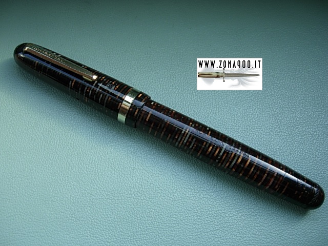 big size, approx 14.2 Cm, original Montegrappa 14K gold nib F flex, (rare version with goldsmith hallmark, never seen before on nibs) excellent conditions, no cracks or damages, surfacely scratches on cap lip and turning knob, brassing spots on clip top 'leverless' style filling system, restored in working order. -ITEM SOLD- To buy or asking info please send a mail to pens@zona900.it specifying product code Thank you. |