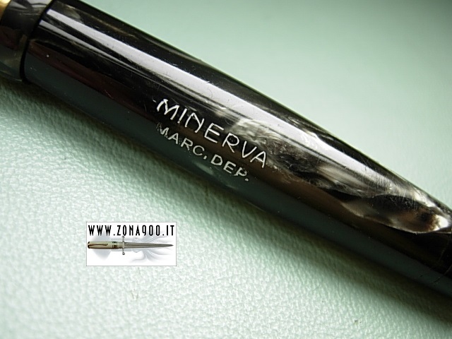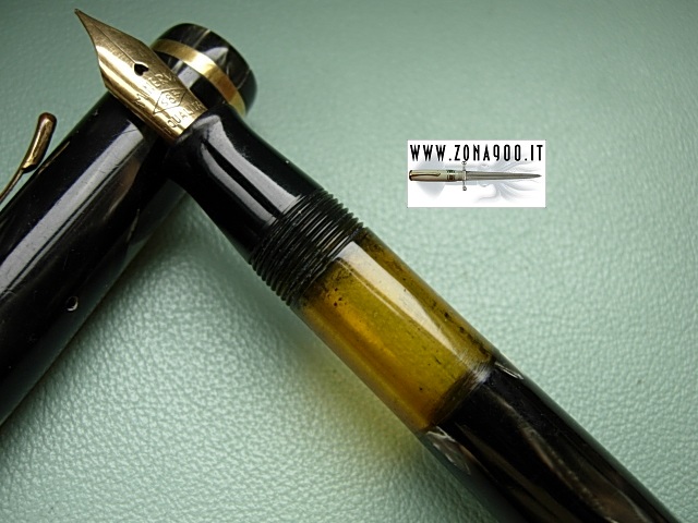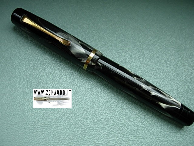 silver gray celluloid, approx 12.8 Cm and quite fat, original Minerva 14K gold nib F lot flexible, (nib is perfect not damaged on tips as could appears in images) good conditions, pen shows surfacely signs by use and a professionally sealed crack on cap lip, no brassing or other damages, perfect yellow transparence, piston filler in working order. -ITEM SOLD- To buy or asking info please send a mail to pens@zona900.it specifying product code Thank you. |