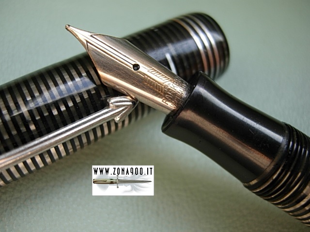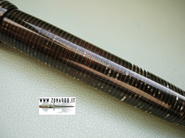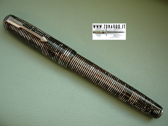 | Vintage Parker Vacumatic fountain pen from middle thirties in grat pearl laminated celluloid, approx 13.5 Cm original Parker 14K gold nib OB flex, great colour, no cracks, brassing or damages, surfacely scratches only, good barrel's transparence, lock down vacumatic filler in working order. -ITEM SOLD- To buy or asking info please send a mail to pens@zona900.it specifying product code. Thank you |