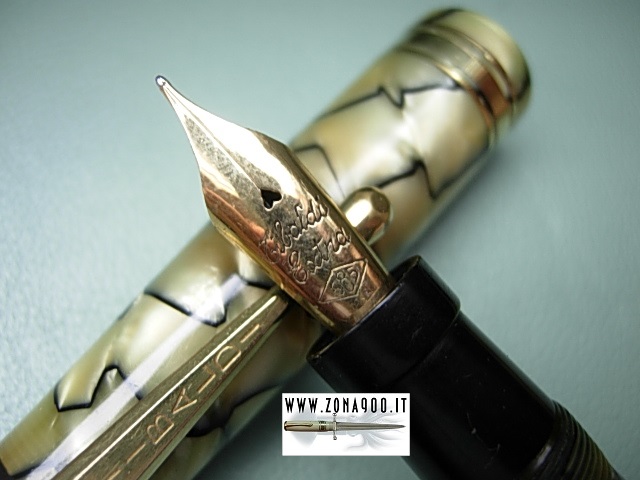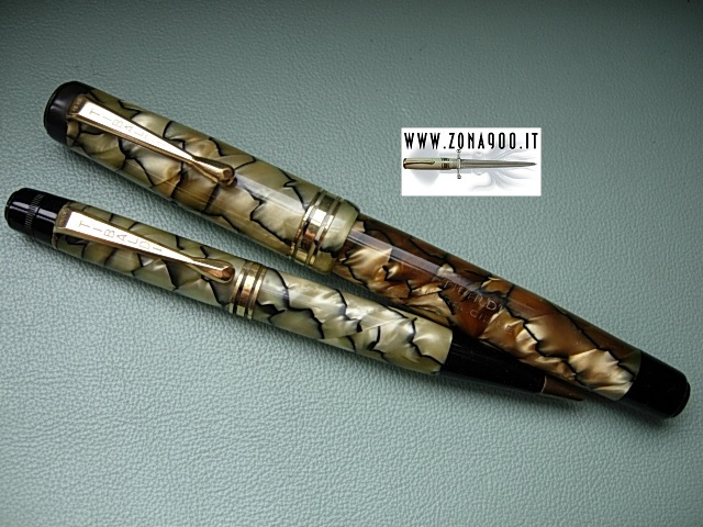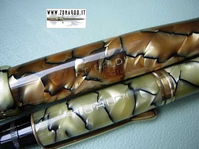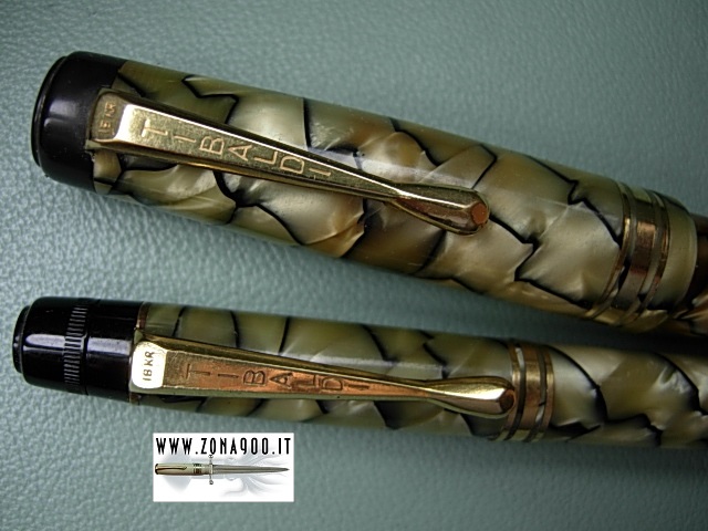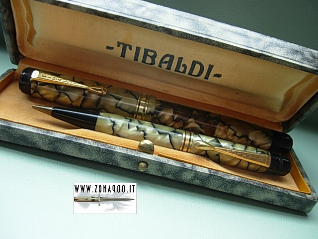 | Tibaldi Infrangibile middle thirties, FP+MP set, black & pearl celluloid, Sr size FP approx 13.8 Cm original 14K nib F flex, MP approx 12 Cm (working), excellent conditions, no cracks, brassing or damages, FP barrel's is bit darkened as usual with this colour button filler in working order, set comes with original box. -ITEM SOLD- To buy or asking info please send a mail to pens@zona900.it specifying product code Thank you. |