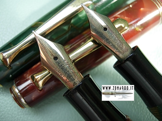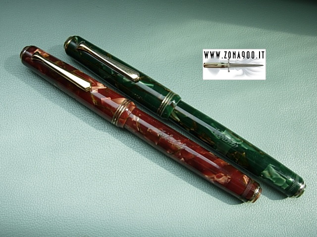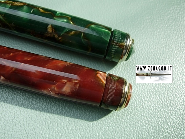 original 14K nib F flex wonderful conditions, NOS never loaded, just dipped to try nib, surfacely age/storage signs, leverless style filling system (unscewing turning knok pressure bar push ink sack, screwing it pen loads ink) restored in working order. Price for one pen, faster choses preferred colour. -BOTH PENS SOLD- To buy or asking info please send a mail to pens@zona900.it specifying product code Thank you. |