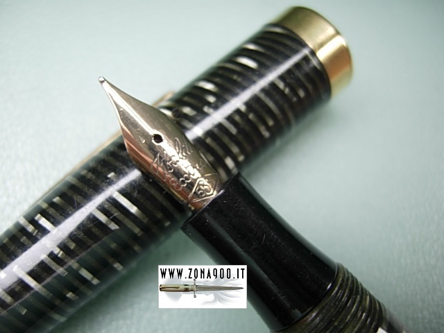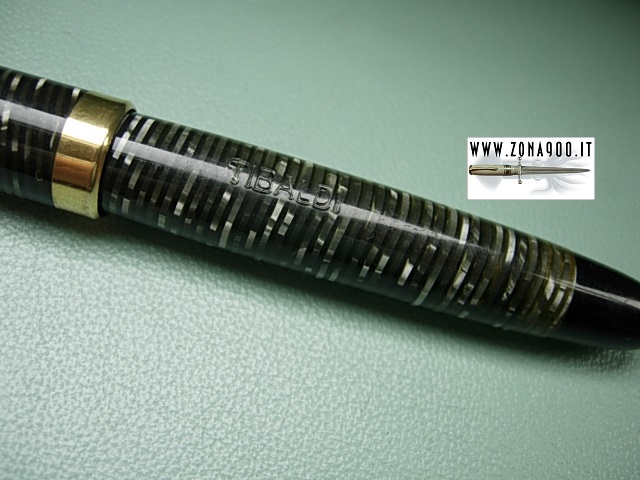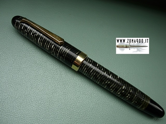 | Very rare as any vintage Tibaldi in silver pearl laminated pearl celluloid, med size approx 12.5 Cm original 14K nib F very flex great conditions, no cracks, brassing or damages, surfacely signs only, button filler in working order. To buy or asking info please send a mail to pens@zona900.it specifying product code Thank you. |